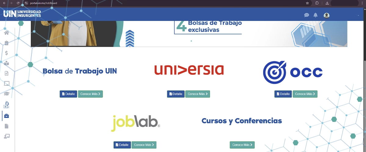 Con más de 3,500 vacantes exclusivas en UIN y una tasa de empleabilidad del 85%, Universia Jobs refuerza nuestro compromiso de abrirte puertas al mundo laboral. Participa en talleres, clases y cursos semanales de empleabilidad para seguirte preparando y enfrentando los retos del triunfo real. ¡Comienza hoy!